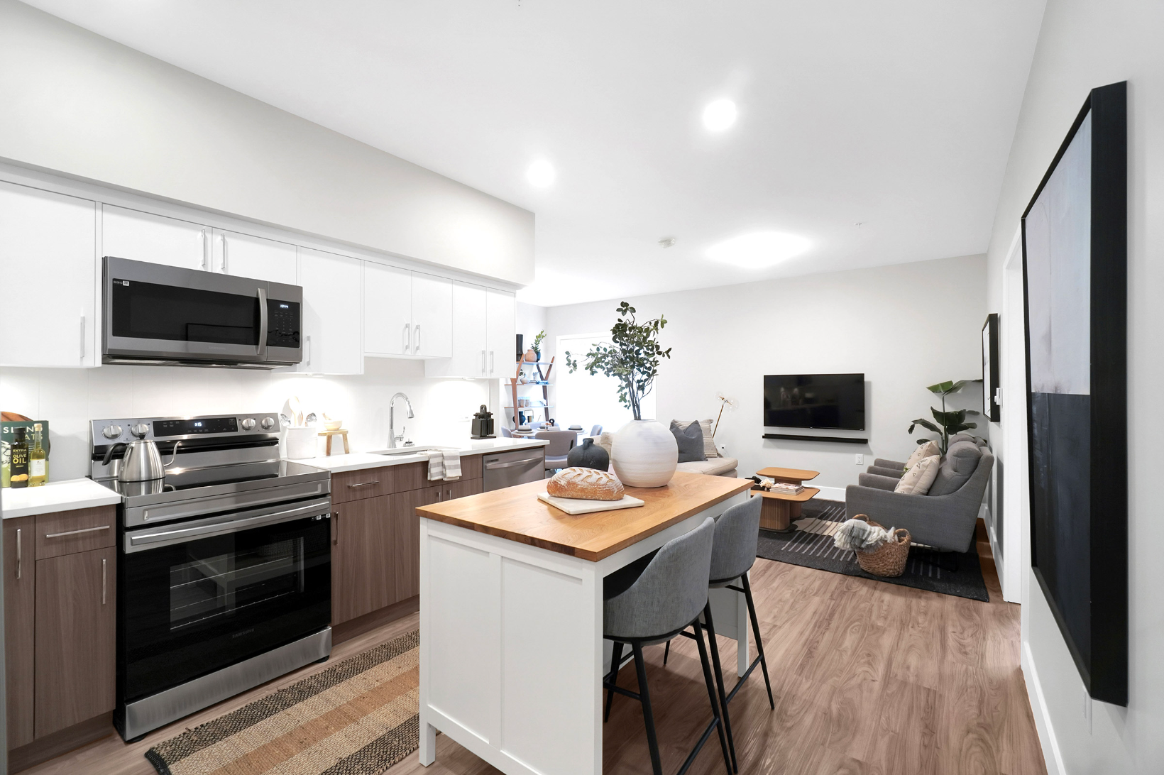 These spacious and comfortable residences, ranging from 381 sq. ft. to 1,157 sq. ft., feature clean-lined Scandinavian design, energy-efficient stainless steel appliances, quartz countertops, vinyl plank flooring, in-suite laundry, and private balconies and terraces.